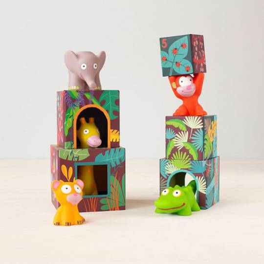 Amb aquest apilable es pot jugar de moltes maneres diferents, promovent diferents aspectes de l'aprenentatge: Col·loca un sobre l'altre, descobrint diferents mides i colors, construeix una torre amb tots els cubs, i després enderroca-la i diverteix-te! A més, podràs diferenciar els diferents animals i les seves casetes segons la mida i el color!