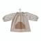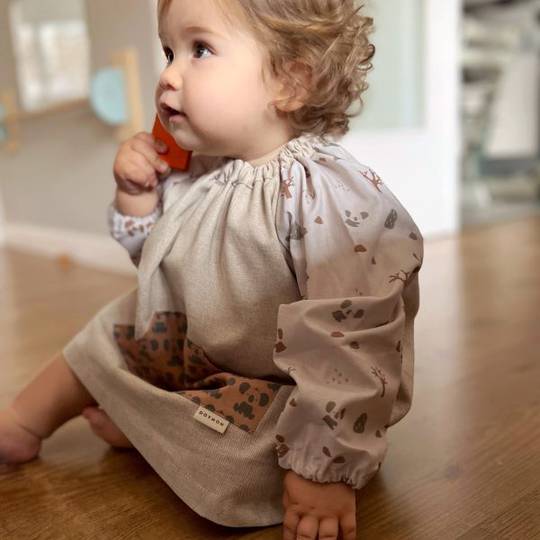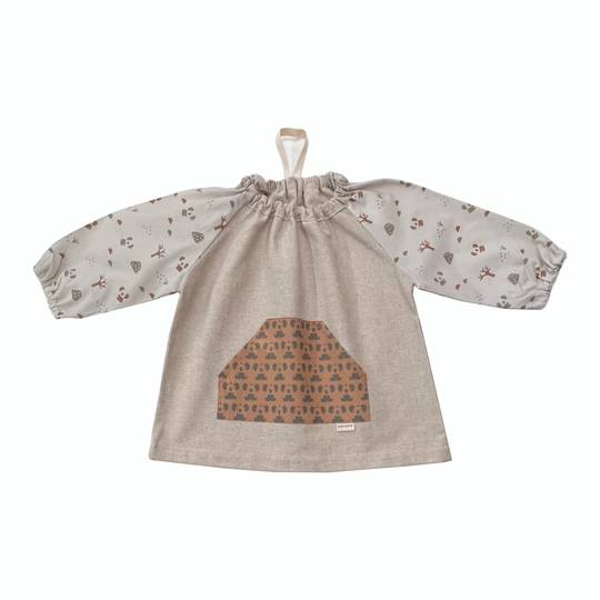Bata confeccionada amb teixit de cotó. Acabada amb goma al coll i punys. Té una beta per penjar, que facilita tenir-la sempre a mà.