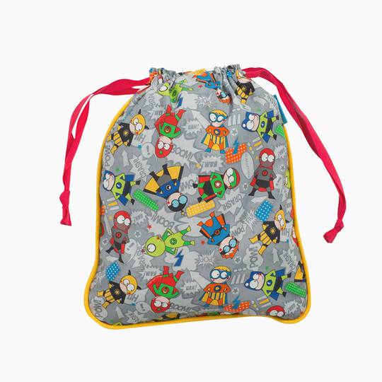 Divertida bossa infantil amb cordons perquè els infants portin el berenar o altres coses a tot arreu. És de tela amb l'interior folrat i porta una agradable combinació de colors.