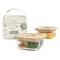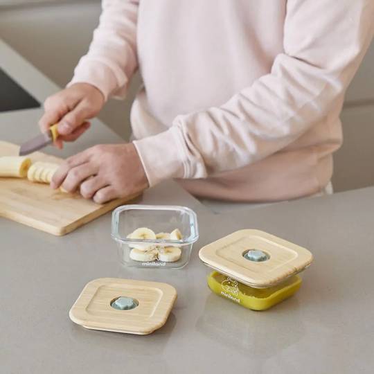 Resistent joc dalimentació per a nadons amb dos hermètics de vidre. La tapa dels hermètics està realitzada en fusta FSC (provinent de boscos sostenibles). Ve en una pràctica funda isotèrmica amb motius de granotetes realitzada amb materials reciclats.