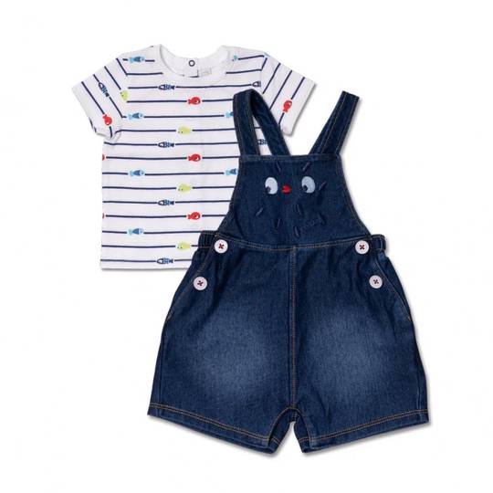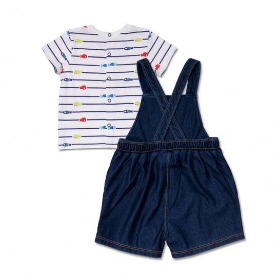Conjunt de punt, dues peces. Samarreta de color blanc a ratlles de color blau i estampat de peixos de colors. Granota de color blau amb estampat.