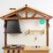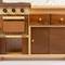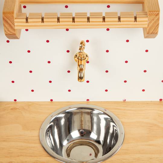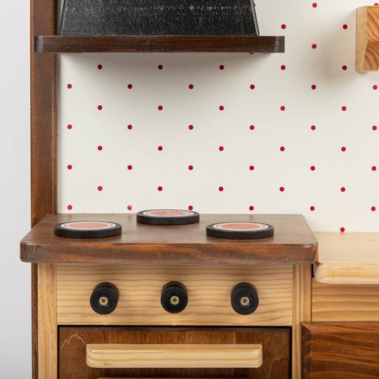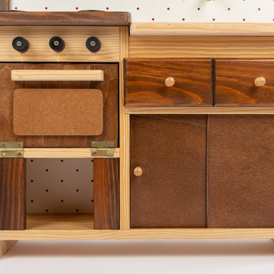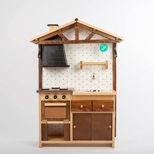 Cuineta de fusta d'estil rústic. Té calaixos, armaris, forn, prestatges, fogons amb pica i aixeta, extractor de fums ... També porta un dipòsit a la part posterior per poder omplir d'aigua i que surti per l'aixeta.