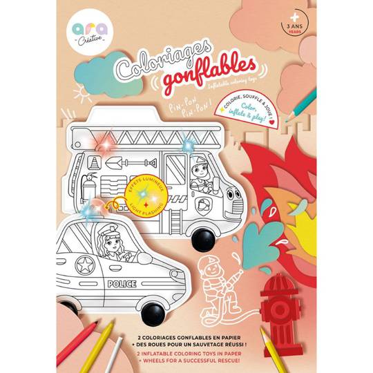 Submergeix-te en l'acció amb el Camió de bombers i Cotxe de policia, dues pàgines per pintar inflables que ofereixen una experiència creativa i interactiva. Cada bàndol té els seus propis herois i elements divertits per al doble de diversió.