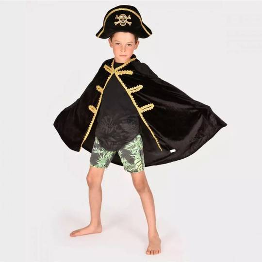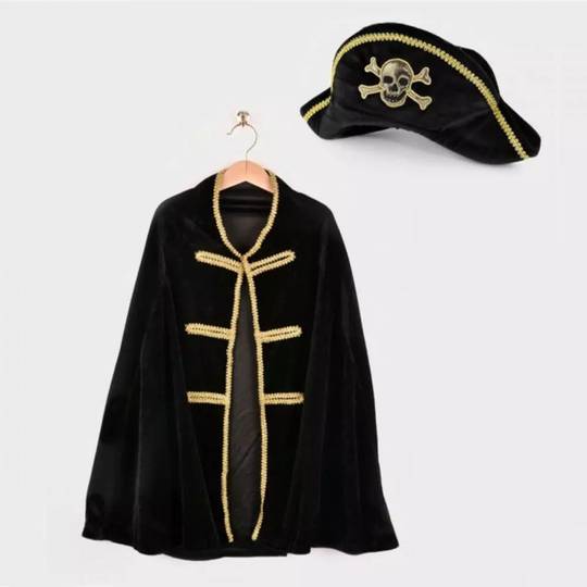 Disfressa de pirata que inclou capa de vellut negre i barret de vellut negre, tots dos amb detalls daurats.