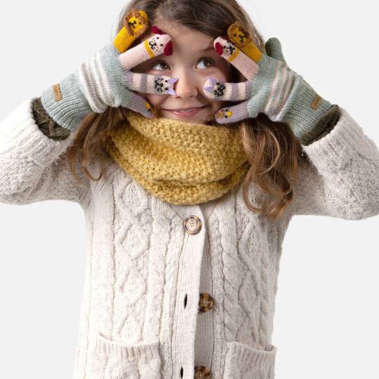 Els guants de titellaire són guants suaus i de punt fi amb cares divertides a la punta dels dits.