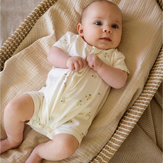 Fet de punt de cotó orgànic elàstic, es mou amb el teu nadó. Els botons a pressió a l'esquena i a l'entrecuix faciliten vestir-lo i canviar el bolquer. Les mànigues curtes, el coll rodó i la vora creuada proporcionen una comoditat addicional. Amb la certificació GOTS (CERES-0366), està fet de manera ecològica. Una peça de roba d'estiu ideal per a les primeres aventures del nadó.