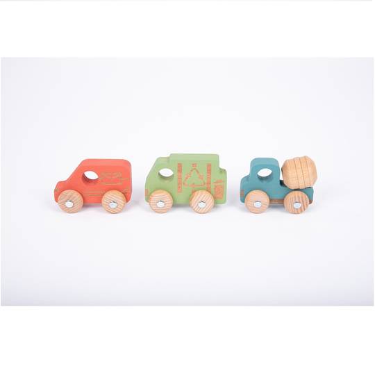 Vehicles de fusta de faig massissa de colors, cadascun amb quatre rodes giratòries, eixos metàl·lics i marques làser. El làser crea una lleugera imitació a la fusta, fent que les peces siguin tàctils per proporcionar un aspecte de descoberta sensorial.