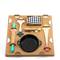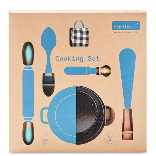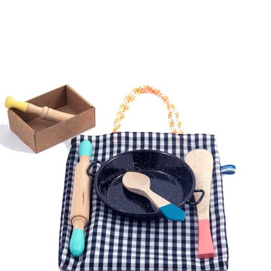 Set de cuinetes de joguina, consta de 4 peces de fusta de faig (espàtula, cullera, morter i corró), 1 paella d'acer esmaltada de 12cm de diàmetre i 1 bossa de tela amb nanses en colors fluor, per poder guardar-ho tot i poder improvisar el joc a qualsevol lloc.