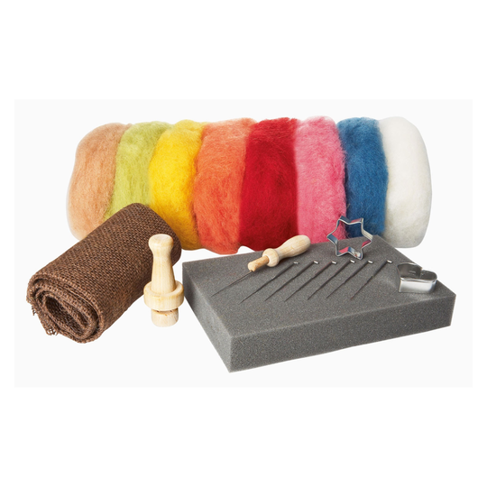 7 agulles de feltre, suport per a 4 o 1 agulla, estoreta per cosir, jute, motlles i llana de fades en vuit colors