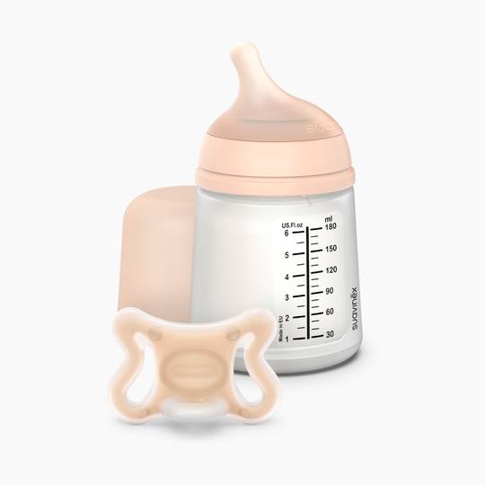 El kit d'inici per a nadons inclou el biberó anticòlics Suavinex Zero Zero amb tetina i xumet de silicona.