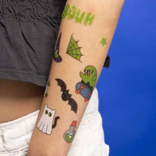 Aquesta làmina de 50 tatuatges temporals et porta a un món ple de fantasmes entremaliats i altres criatures divertides (i lleugerament aterridores).