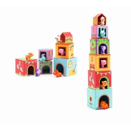 Amb aquest apilable es pot jugar de moltes maneres diferents, promovent diferents aspectes de l'aprenentatge: Col·loca un sobre l'altre, descobrint diferents mides i colors, construeix una torre amb tots els cubs, i després enderroca-la i diverteix-te! A més, podràs diferenciar els diferents animals i les seves casetes segons la mida i el color!