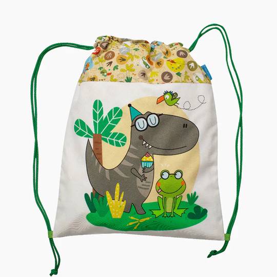 Divertida bossa infantil amb cordons perquè els infants portin el berenar o altres coses a tot arreu. És de tela amb l'interior folrat i porta una agradable combinació de colors.