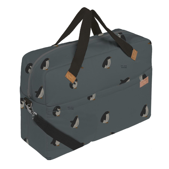 Bossa de cotó per a portar les coses del nadó. Amb cremallera central, dues butxaques exteriors i 3 d'interiors. Tira llarga per a poder-la portar penjada còmodament i dues nances de mà.