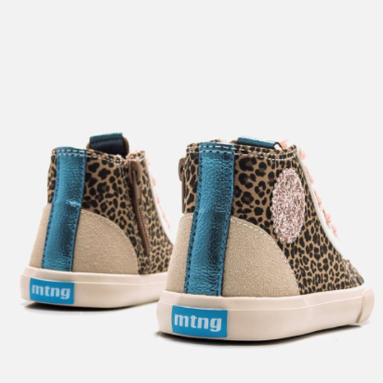 Sabates tipus botí amb estampat de lleopard, model Free de Mustang. El disseny de canya mitjana i els cordons en to rosa aporten un toc divertit i un tancament funcional. El lateral presenta un cercle de glitter rosa que afegeix personalitat al seu estil urbà.