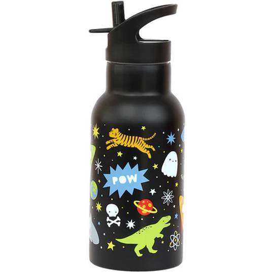 Ampolla termo de doble paret d'acer inoxidable amb una estampa alegre. L'ampolla ve de sèrie amb un tap de rosca, un bec per beure i una palla per a begudes fredes.