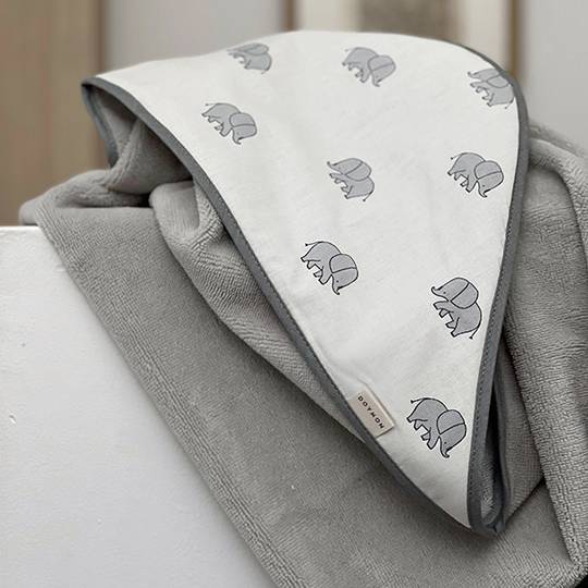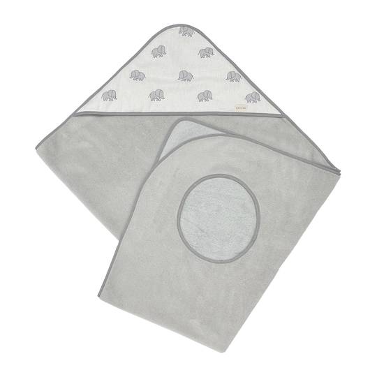 Capa de bany Duo, amb una goma per a que l'adult se la pugui penjar al coll i tenir així les mans lliures per a poder agafar al nadó.