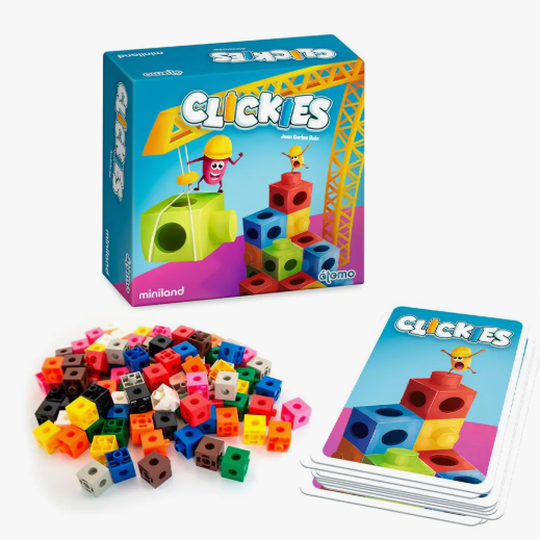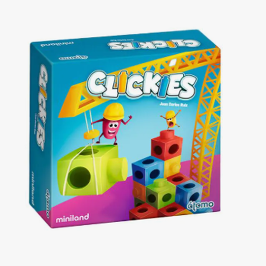 Clickies és un emocionant joc de taula que desafia els jugadors a utilitzar la seva creativitat, destresa i rapidesa per construir estructures úniques amb policubs de colors.