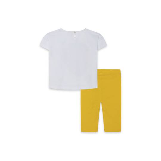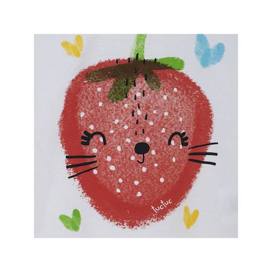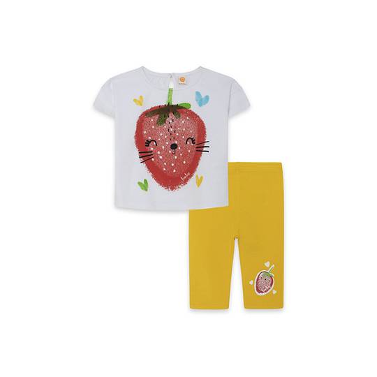 Conjunt samarreta i legging pirata. Samarreta blanca de màniga curta amb dibuix frontal de maduixa i legging pirata groc amb detall dibuix maduixa Fruitty Time