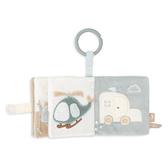 Explora el món amb aquest llibre d'activitats únic amb la temàtica "On The Go"! Amb quatre pàgines de tela acanalada súper suau en verd mar i blau núvol, aquest llibre és perfecte per a les petites mans curioses. Cada pàgina està plena de sorpreses: arrugues, cordes divertides i miralls petits i bonics amb forma de semàfor. El llibre inclou una clau divertida amb un so cruixent per a una diversió addicional durant el joc.