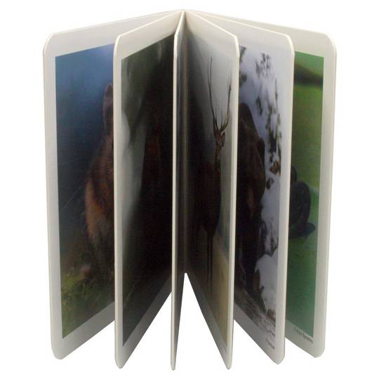 Imatges de: Ratolí, papallona, ocell, esquirol, guineu, cèrvol, mussol, ós bru, cargol i granota.