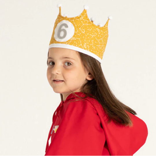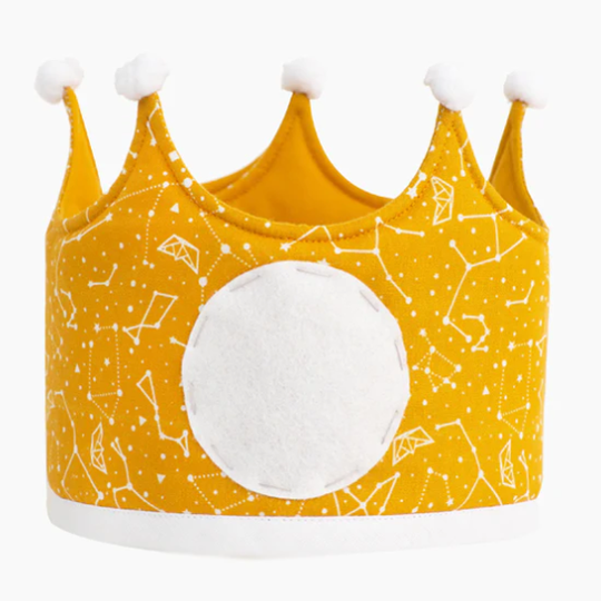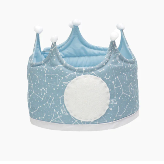 Corona d'aniversari de roba, feta de cotó i farcit de polièster; color gris-blau.