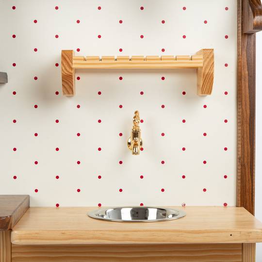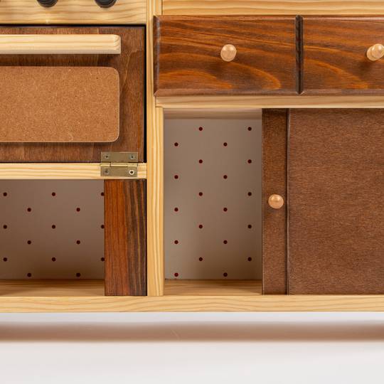 Cuineta de fusta d'estil rústic. Té calaixos, armaris, forn, prestatges, fogons amb pica i aixeta, extractor de fums ... També porta un dipòsit a la part posterior per poder omplir d'aigua i que surti per l'aixeta.