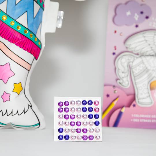 Personalitza el teu unicorn amb els adhesius de pedreria inclosos a la bossa.