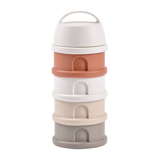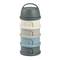Dossificador per a la llet en pols. 4 compartiments de 100cc cada un, apilables, amb tancamanet amb rosca i tapa interna.