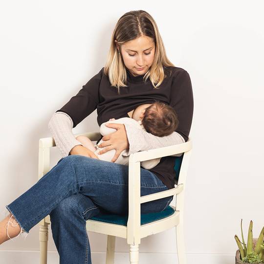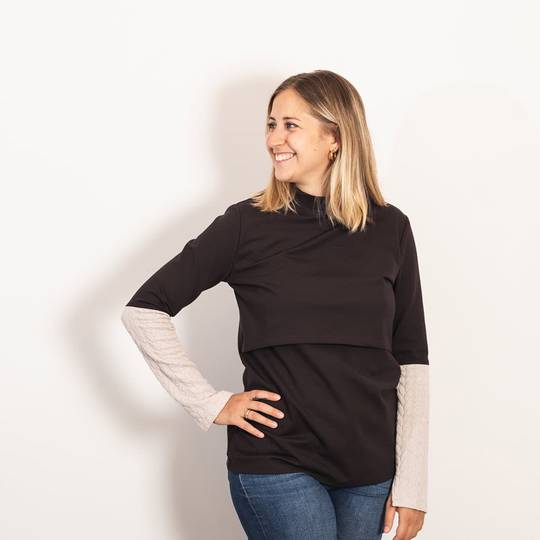 Jersei de màniga llarga a contrast ambuna petita obertura de 5cm al final. També compta amb una obertura a l'alçada del pit per facilitar la lactància materna de forma còmode i sense passar fred.