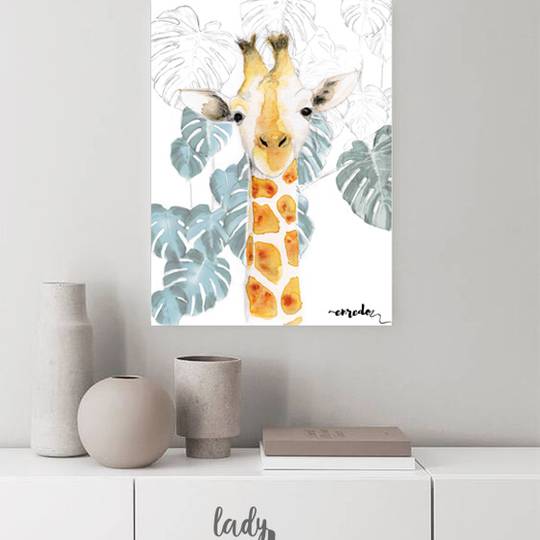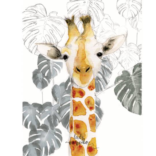 Il·lustració d'una girafa amb fons de fulles en tons verd, ocre i negre.