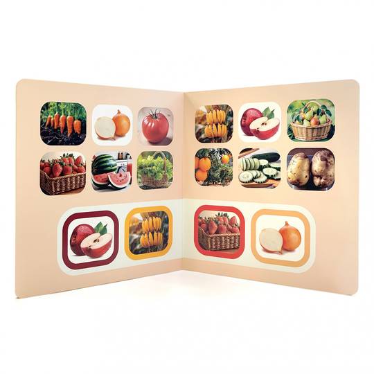 Llibre amb imatges reals per buscar les fruites i hortalisses més comunes.