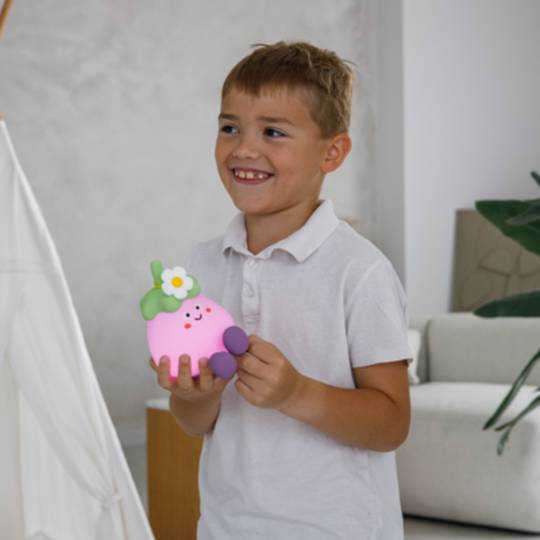 La llum nocturna GIOeggplant afegeix un toc de color i fantasia a l'habitació dels nens amb la seva divertida forma d'albergínia. El disseny suau i flexible, i la silicona lliure de BPA la fan totalment segura i perfecta per abraçar. La llum suau i regulable al tacte crea l'ambient perfecte per relaxar-se, explicar contes o agafar el son. El temporitzador de 30 minuts fa que el llum s'apagui automàticament, cosa que estalvia energia i ajuda el teu fill a gaudir d'un somni tranquil.