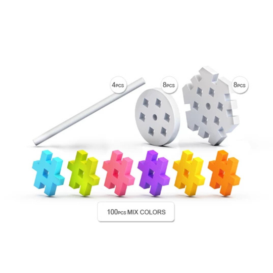 El joc consta de peces agradables al tacte fetes de plàstic segur. Hi ha peces de construcció, com eixos, rodes i hexàgons, per animar els nens a construir models 3D. Cotxes, bicicletes, robots o monstres: aquestes són només algunes de les coses que es poden construir amb els nostres colorits i atractius blocs. La imaginació il·limitada dels nens els ajudarà a crear els seus propis escenaris de joc! L'educació a través del joc és la clau per al desenvolupament de les habilitats tant mentals com a motores del teu infant