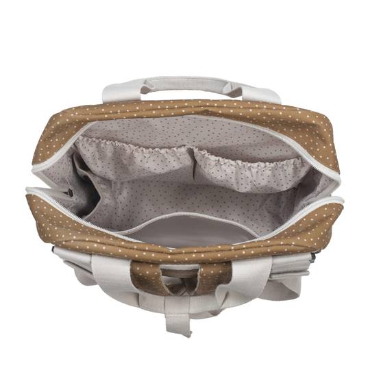 Inclou un canviador a joc amb la bossa de maternitat i una butxaca plastificada per emmagatzemar la roba mullada i aïllar la humitat de la resta de la motxilla.