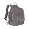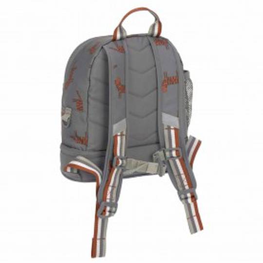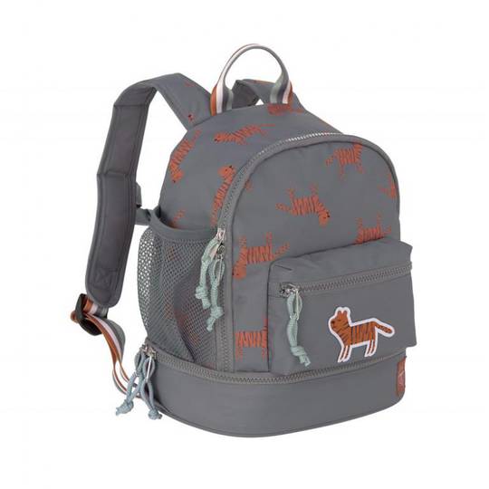 La motxilla de material exterior hidròfug ofereix un gran compartiment principal. Al gran compartiment principal hi ha espai per canviar-se de roba, entrepans, fruita i aperitius. Si el menjar ha de romandre fresc durant un període de temps més llarg, es pot col·locar un paquet de gel al compartiment separat de la base de la motxilla i assegurar-lo mitjançant les gomes. Es pot guardar una ampolla per beure a la butxaca de malla de l’exterior. Una altra butxaca al davant proporciona un lloc segur per a objectes més petits com una clau. Les corretges encoixinades es poden ajustar individualment i una corretja de pit proporciona una estabilitat addicional. A l'interior inclou un espai on posar el nom de l'infant i un estoig.