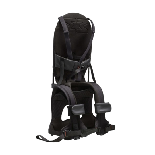 Mentre descobreix el món, el teu fill s'asseu amb seguretat sobre les teves espatlles assegurat per un cinturó i corretges per a les cames. Tots dos amb un elegant detall de pell sintètica.