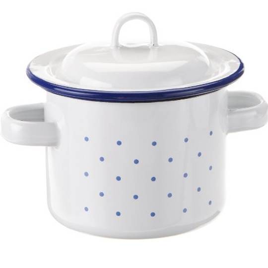 Olla gran d'esmalt amb tapa i nanses pintada de color blanc i puntets blaus.