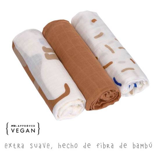 Pack de tres muselines fabricades amb la combinació perfecta de fibra de bambú i cotó que ofereixen la major naturalitat i confort.