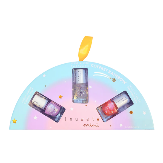 Un set Arc de Sant Martí amb tres esmalts d'ungles a base d'aigua per a infants: un rosa amb aroma de maduixa, un malva amb aroma de nabius i transparent estrellat!