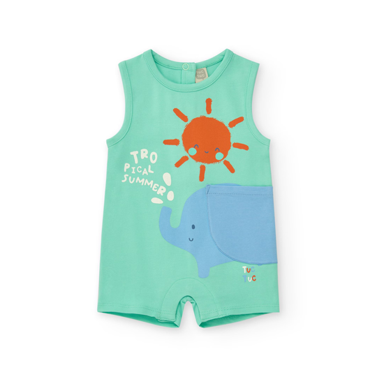 Pelele de punt en color verd amb estampat d'elefant i detalls tropicals. La part inferior destaca pel disseny estampat de fulles en blau, verd i taronja que aporta un toc divertit. Dissenyat amb mànigues curtes i tancament a pressió a la part posterior per a més comoditat.