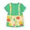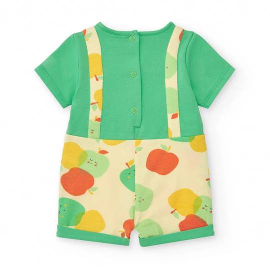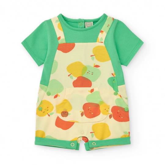Pelele sencer amb estampat de pomes en tons groc, taronja i verd. Inclou una butxaca frontal i tancaments a pressió a darrera i entrecuix per facilitar-ne la col·locació.