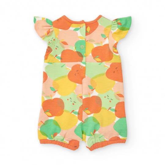 Pelele sencer amb estampat de pomes en tons groc, taronja i verd. Inclou una butxaca frontal i tancaments a pressió a darrera i entrecuix per facilitar-ne la col·locació.