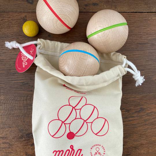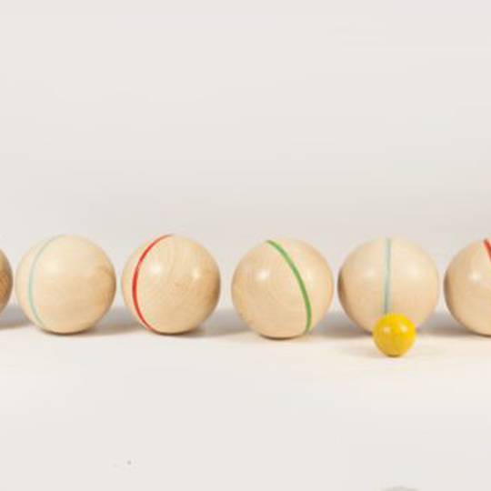 Petanca de fusta de faig que conté 6 boles de 6,8 cm de diàmetre i un bolig.