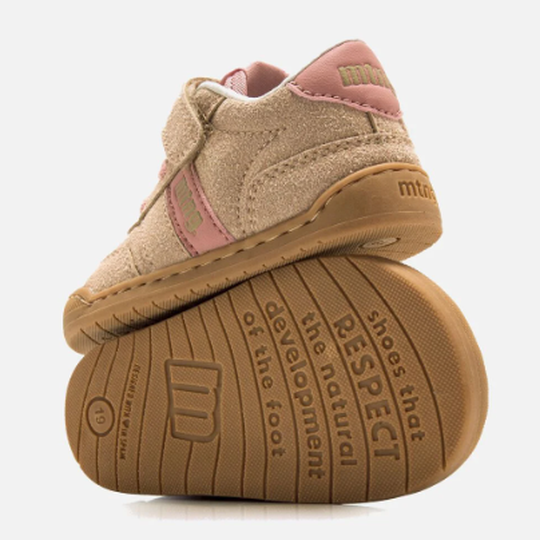 Gràcies a la seva punta ampla permet el lliure moviment dels dits dins de la sabata. La seva sola té 3 mm de gruix i amb zero drop (totalment plana) respecta el desenvolupament natural del peu del petit/a i els seus elements flexibles i torsionables fan que el peu del nen no estigui encorsetat per l'estructura de la sabata.