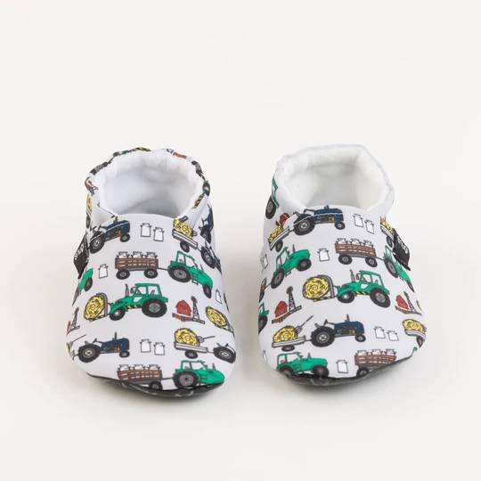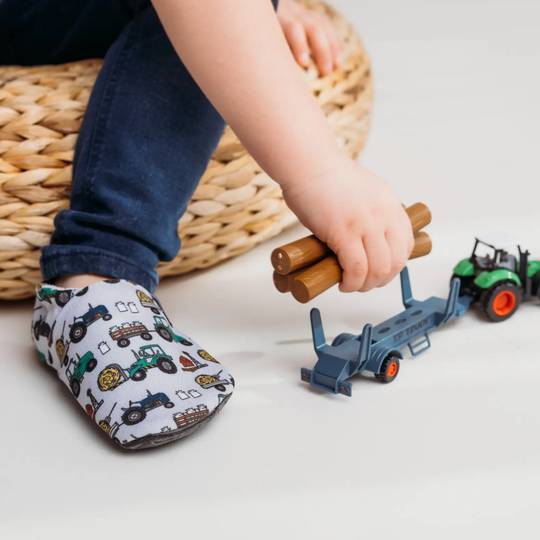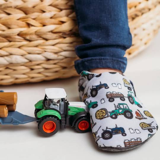 Sabatilles barefoot per a infants Snugi amb un estampat divertit de tractors i maquinària agrícola, lleugeres i transpirables per a la comoditat dels peus petits, fàcils de rentar, amb sola antilliscant, perfectes per a la diversió i el joc segur a casa, a l'escola bressol o a l'escola.