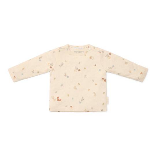 Samarreta de màniga llarga amb botons a l'espatlla, imprès sobre teixit Interlock sorra melange. Amb caràcters de guineu i fulles. 100% cotó orgànic