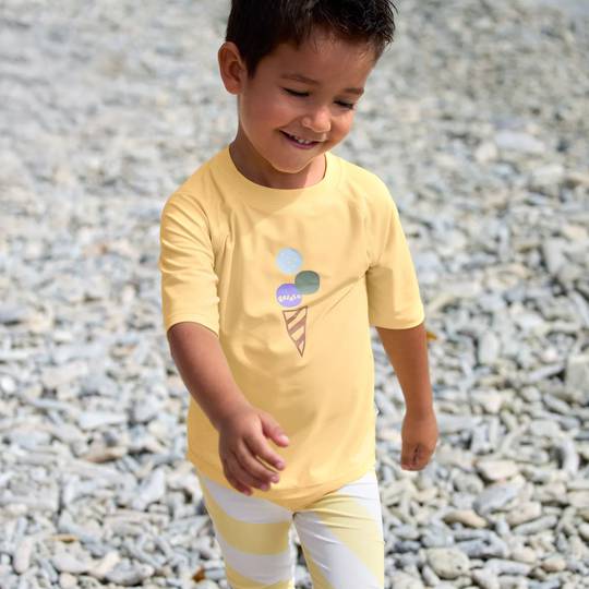 Samarreta de màniga curta amb protecció solar. Fabricada amb un teixit suau que facilita el seu canvi. La protecció UV 50+ combinada amb protecció solar garanteix que la pell sensible dels infants estigui ben protegida a l’estiu.