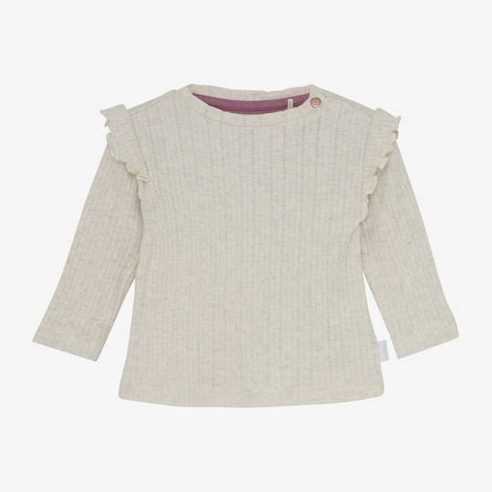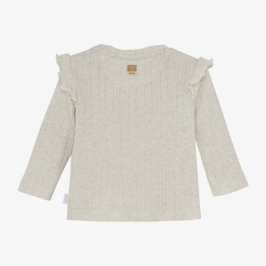 La samarreta de màniga llarga Thornwood està feta de cotó certificat GOTS (CU1392474). Presenta un coll rodó amb un botó de clic i volants decoratius a les espatlles. Amb el cotó GOTS, estàs fent la millor elecció per a tu, el teu infant i el món. Des de la manera respectuosa amb el medi ambient en què es produeix el cotó fins a la prohibició del treball infantil, tot compleix alts estàndards. I realment és meravellós de portar!