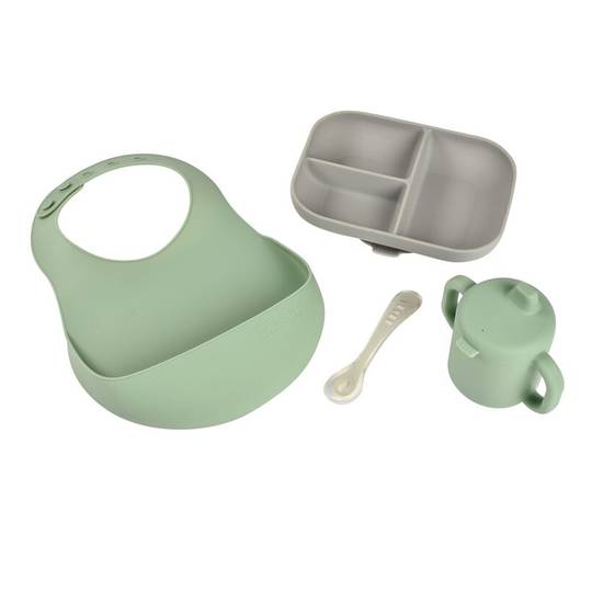 Joc de vaixella de silicona compost per una tassa d'entrenament, un plat compartimentat, un pitet i una cullera per a nadó